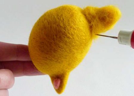 8. Чтобы сделать плоское основание, держите деталь между большим и указательным пальцем и осторожно уваливайте низ иглой, пока он не начнёт держать форму. Края лучше обрабатывать одной иглой. Когда туловище примет желаемую форму и станет достаточно плотным, приваляйте лапы.