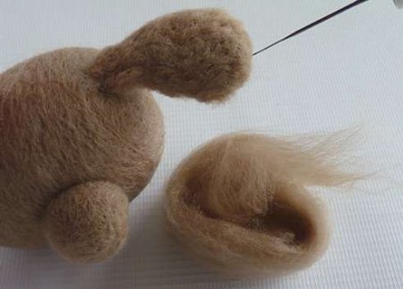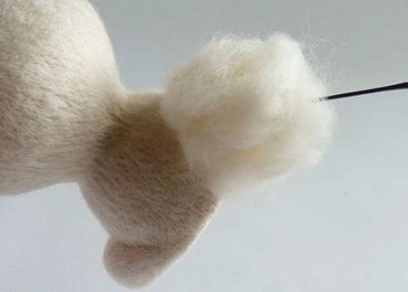 10. Возьмите небольшой пучок шерсти основного цвета — для кролика чуть больше, для остальных чуть меньше. Одной иглой сформируйте хвостик и приваляйте его к туловищу.