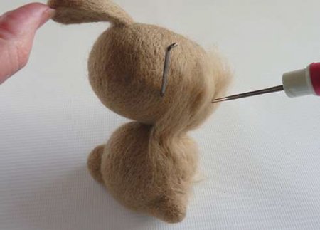 4. Для ушек каждого животного возьмите два одинаковых пучка шерсти. Сначала придайте им примерную форму одной иглой на щётке/губке для валяния, потом приваляйте к телу. Если вы делаете кролика, сложите два пучка шерсти пополам, чтобы получились ушки высотой 3–4 см. В середину каждого ушка добавьте немного розовой шерсти.
