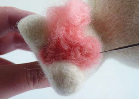 5. Если вы делаете котёнка, возьмите немного шерсти и сформируйте два небольших конуса высотой 1 см. Одной иглой приваляйте чуть-чуть розовой шерсти в середину каждого ушка.