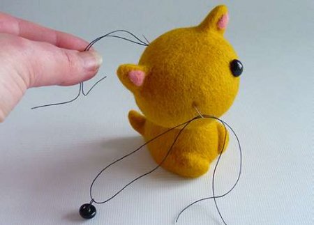 9. Для лапок каждого зверька отщипните два одинаковых пучка шерсти, сложите их вдвое и придайте лапкам форму одной иглой на щетке/губке для валяния. Потом приваляйте их к туловищу. Чтобы правильно расположить лапки, ориентируйтесь на фотографию ниже.