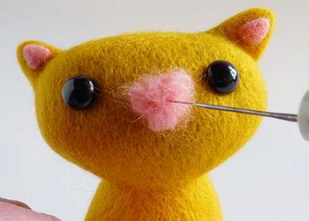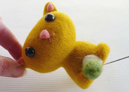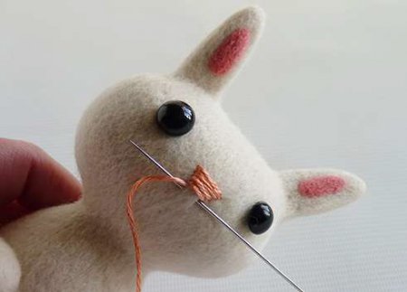 18. Возьмите чуть-чуть розовой шерсти и сформируйте носик. Одной иглой приваляйте его к мордочке. Возьмите розовую нить для вышивания и вышейте ротик двумя прямыми стежками.