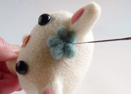 15. Из пучка розовой шерсти сформируйте сердечко и приваляйте одной иглой кролику на брюшко.