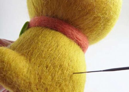 12. Продолжайте приваливать шерсть по кругу, чтобы надёжно прикрепить голову к телу. Приваляйте незакреплённые концы волокон, уложив их вдоль тела.