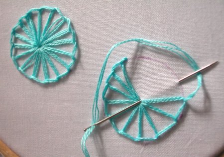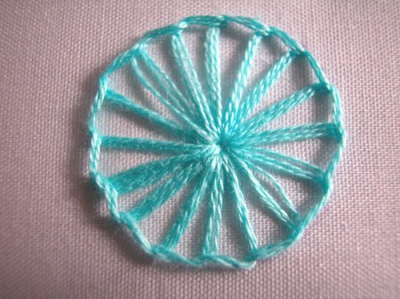 Стежок Петельное колесо (Buttonhole Wheels)Петельные колёса вышиваются против часовой стрелки. Нить по внешнему краю образует витую границу. Выведите нить на лицевую сторону на краю круга, проведите на изнаночную сторону через центр в точке 2 и выведите на краю, близко от предыдущего стежка (точка 1). Нить должна располагаться ПОД иглой, как показано на рисунке (точка 3). Слегка натяните нитку. Продолжайте вышивать по всей окружности. Нить последнего стежка проводится под первым стежком. Фото: sarahwhittle.blogspot.ru