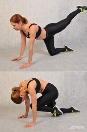 Встаньте на локти и колени. Поднимите левое колено: нога согнута примерно под прямым углом, бедро примерно параллельно полу. В течение всего упражнения старайтесь не опускать бедро ниже этого уровня. Подтягивайте колено к левому плечу сбоку (дотянуться, скорее всего, не получится, но направление движения именно такое) и возвращайте в исходное положение на весу сзади. На пол колено не ставим до окончания повторений!
