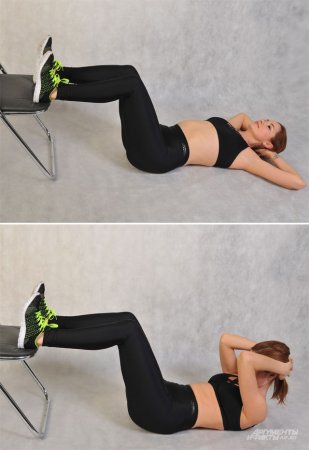 Лёжа на спине, положите ступни на сиденье стула или диван, колени согните. Поясницу прижмите к полу, руки под головой. Поднимите голову, опуская подбородок на грудь, далее плавно поднимайте шею, плечи, верхнюю часть спины. Лоб направляется не к коленям, а к нижней части живота. Садиться не надо, максимум – оторвать лопатки. Затем так же плавно в обратном порядке вернитесь в исходное положение. Не забудьте опустить и затылок.