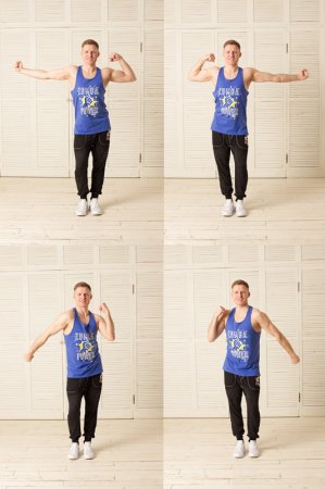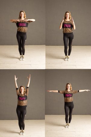 Движение 2. Выполняется так же, как и первое, на основе базового ритма Merengue, активно работает плечевой пояс. Если в первом движении важна координация, то во втором руки движутся синхронно, но более задействованы мышцы спины и дельтовидная мышца плеча.
