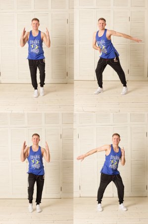 Движение 1. Один из базовых ритмов, используемых в зумба-фитнес — Merengue. Шаг, показанный на картинке, называется Merengue march. Варианты движения рук — вверх и в стороны. При данном маршевом движении активно работает плечевой пояс и сердечно-сосудистая система. Это движение является аэробным.