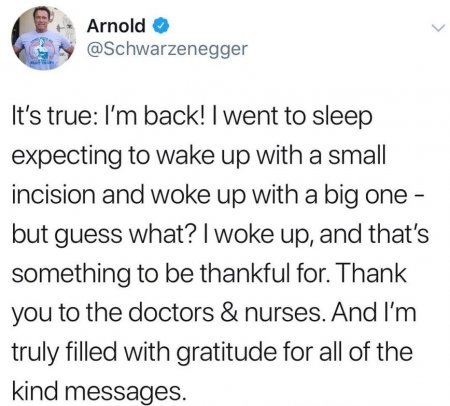 Арнольд Шварценеггер недавно напугал поклонников всего мира, когда попал на операционный стол. Артист обратился в медцентр Лос-Анджелеса на плановую процедуру, а врачи в экстренном порядке решили провести операцию на его сердце. Первой фразой звезды «Терминатора» после оперативного вмешательства была «Я вернулся», что сильно обрадовало фанатов. Он поделился с ними своими эмоциями:«Это правда: я вернулся! Я уснул в ожидании, что проснусь с маленьким надрезом, но проснулся с большим. Но знаете что? Я проснулся и я благодарен за это. Спасибо врачам и медсестрам. И я благодарю вас за поддержку и добрые слова».