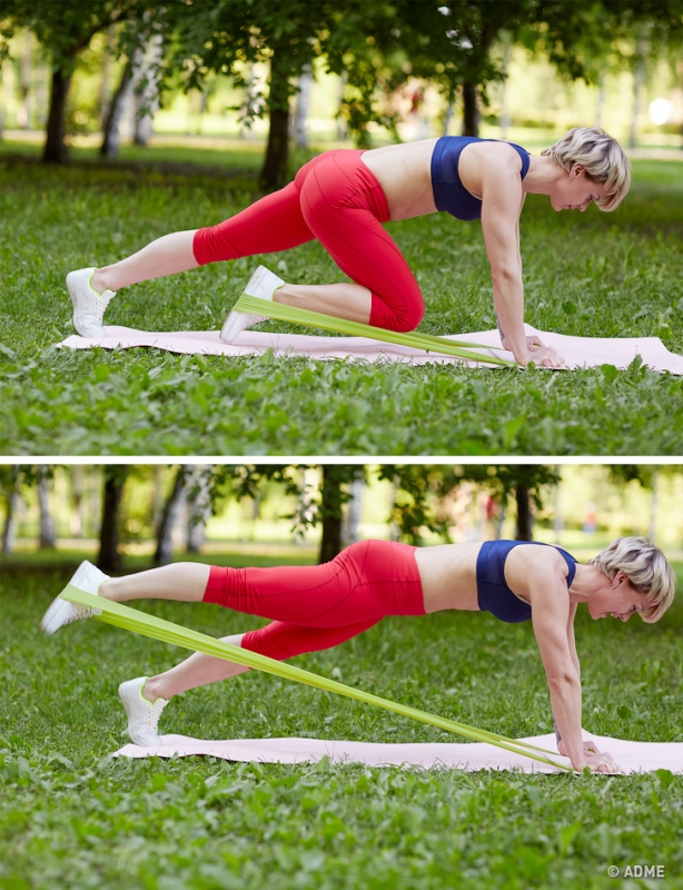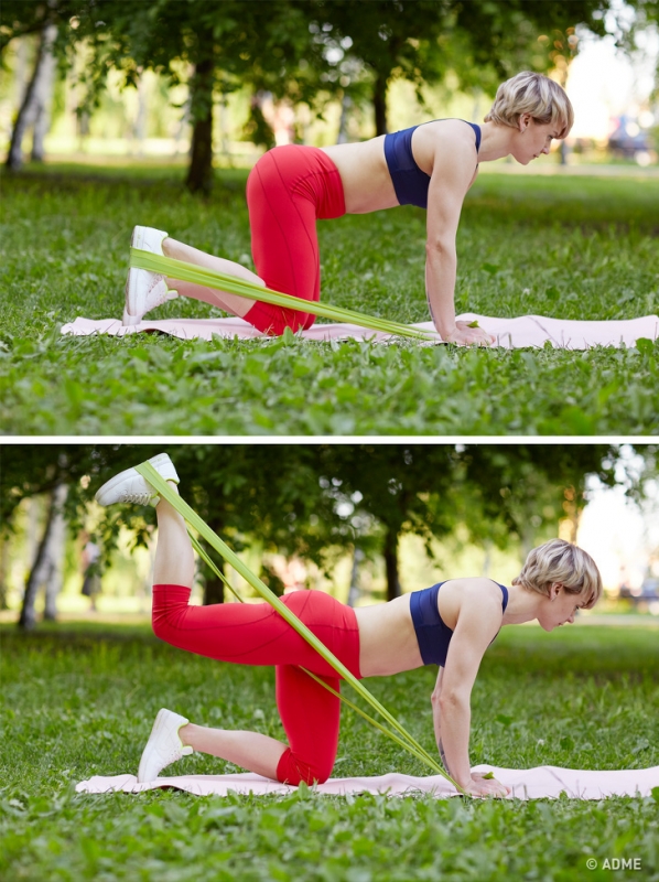 Встаем на четвереньки и снова берем ленту за свободные концы, натягивая ее ногой. Выполняем 10–15 махов согнутой ногой вверх. Это упражнение отлично подкачивает мышцы ягодиц.