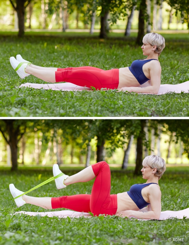 Ложимся на спину и упираемся локтями в пол. Фиксируем резинку на ступнях и делаем упражнение «велосипед» в течение 2–3 минут.