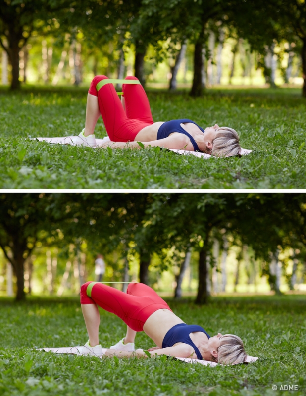 Оставляем ленту в том же положении и выполняем обычные приседания. Повторите упражнение 15–20 раз.