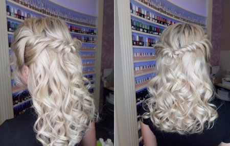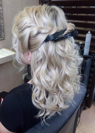 - Для оформления укладки возьмите пару передних локонов по бокам и поочередно скрутите их в жгут, добавляя пару прядей. Докрутив до середины головы, заколите пряди с обеих сторон зажимом. Слегка зафиксируйте лаком.