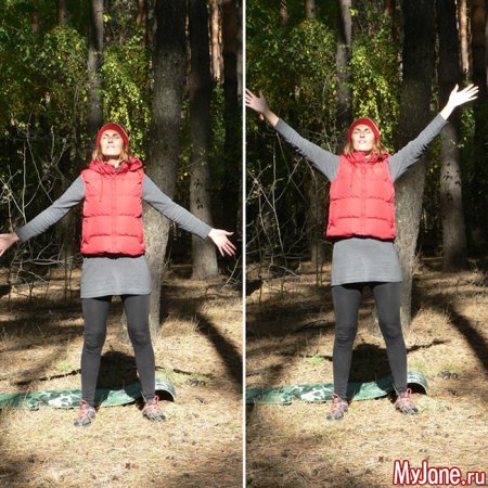 Для начала встаньте прямо, ноги разместите на ширине плеч, руки немного разведите в стороны так, чтобы они не касались корпуса (ладонями вперед.). Поднимайте медленно через стороны руки вверх и одновременно сделайте 30 синхронных вращательных движений по небольшому радиусу и еще 30 больших кругов.