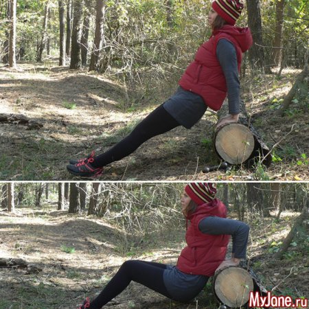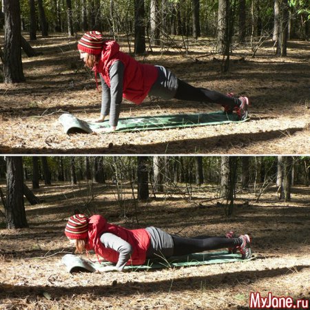 Теперь поработаем над руками с весом собственного тела. Для этого примите положение прямая планка с упором на ладони прямых рук и мыски ног и выполните 15 отжиманий. Следите, чтобы тело от макушки головы до пят находилось на одной линии. Для этого втяните живот и опустите ягодицы. Во время сгибания рук старайтесь, чтобы угол между плечом и предплечьем был острым. На улице для выполнения этого упражнения (если нет возможности использовать каремат) вы можете приспособить поверхность скамьи, пенек или ствол поваленного дерева.