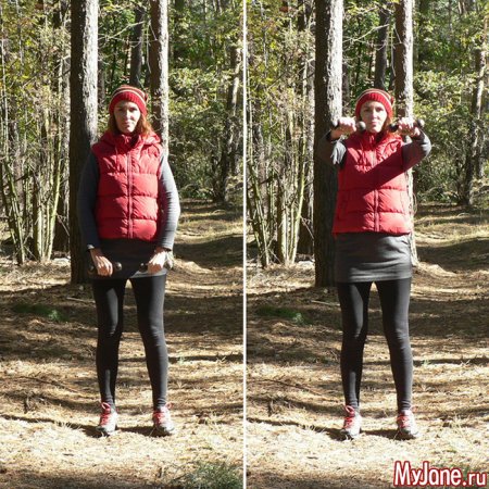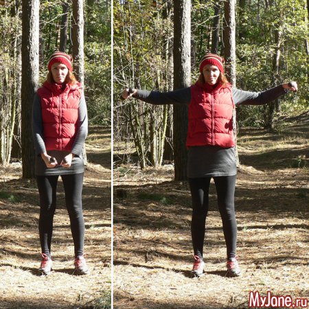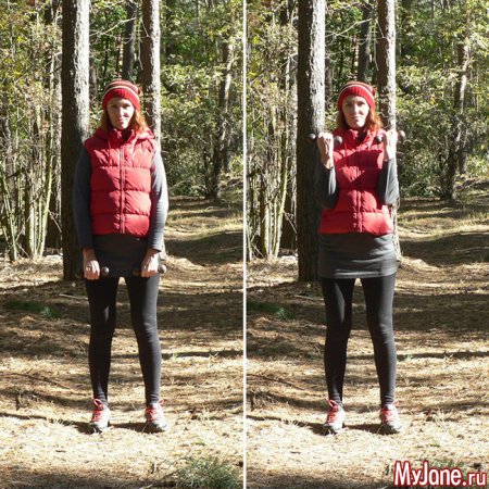 Этой осенью мы приглашаем наших читательниц не забывать о фитнесе для рук. Ведь новогодние праздники не за горами, когда вам наверняка захочется надеть открытое платье. И будет обидно, если ваш праздничный look будет испорчен дряблой линией плеча.И, пока еще не задождило, есть предложение «пофитнесить» на улице. Тем более, что панорамы золотой осени могут стать дополнительной мотивацией для подобных тренировок и активного времяпрепровождения на свежем воздухе. Для эффективного фитнеса захватите с собой пару гантелей. Упражнение 1 Для начала встаньте прямо, ноги разместите на ширине плеч, руки немного разведите в стороны так, чтобы они не касались корпуса (ладонями вперед.). Поднимайте медленно через стороны руки вверх и одновременно сделайте 30 синхронных вращательных движений по небольшому радиусу и еще 30 больших кругов. Упражнение 2 Теперь поработаем над руками с весом собственного тела. Для этого примите положение прямая планка с упором на ладони прямых рук и мыски ног и выполните 15 отжиманий. Следите, чтобы тело от макушки головы до пят находилось на одной линии. Для этого втяните живот и опустите ягодицы. Во время сгибания рук старайтесь, чтобы угол между плечом и предплечьем был острым. На улице для выполнения этого упражнения (если нет возможности использовать каремат) вы можете приспособить поверхность скамьи, пенек или ствол поваленного дерева. Упражнение 3 Усложните прямые отжимания подъемом одной ноги и подачей колена через сторону к одноименному локтю. Упражнение в фитнес-среде называется «спайдер». Сделайте 15 повторов этого движения. Упражнение 4 Следующая задача – сделать 15 обратных отжиманий. Для этого расположитесь спиной к невысокой опоре, упритесь в нее ладонями прямых рук, стопы подайте вперед. Сгибайте руки в локтях, ягодицы опускайте вниз, затем возвращайтесь в исходное положение. Упражнение 5 И последнее упражнение, которое будем выполнять с собственным весом, – поочередный подъем ног в прямой планке с упором на локти. Каждую ногу поднимите над землей по 15 раз. Упражнение 6 Далее переходим к работе с гантелями. Возьмите в каждую руку по утяжелителю. Встаньте прямо, ноги расположите на ширине плеч, руки – вдоль корпуса, ладони разверните вперед. Поочередно сгибайте в локте то одну, то другую руку, гантель подтягивайте к груди, ладонь разворачивайте к себе. Сделайте по 15 таких сгибаний каждой рукой. Упражнение 7 Теперь одновременно сгибайте и подтягивайте к груди обе руки. Сделайте 15 повторов упражнения. Упражнение 8 Снова стоим прямо, ноги на ширине плеч, руки с гантелями опустите перед собой, ладони разверните друг навстречу дружке. Разводите руки в стороны, локти держите полусогнутыми. Сделайте 15 повторов упражнения «бабочка». Упражнение 9 В том же положении, стоя прямо, руки опустите перед собой, ладони с гантелями разверните к бедрам. Поднимайте руки перед собой до уровня глаз, локти держите полусогнутыми. Сделайте 15 повторов упражнения. Упражнение 10 Теперь согните руки в локтях и расположите гантели на уровне ушей. Выпрямляйте руки в локтях и жмите гантели вверх над головой. Сделайте 15 повторов упражнения. Упражнение 11 Прямые руки с гантелями поднимите над головой, сгибайте руки в локтях, гантели заводите за голову. Сделайте 15 повторов упражнения. Упражнение 12 Для выполнения последнего упражнения ко