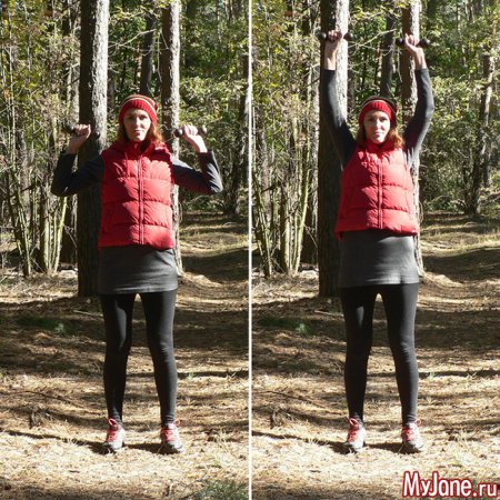 Теперь согните руки в локтях и расположите гантели на уровне ушей. Выпрямляйте руки в локтях и жмите гантели вверх над головой. Сделайте 15 повторов упражнения.