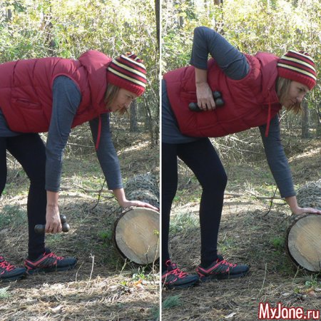 Для выполнения последнего упражнения комплекса найдите невысокую опору. Вполне подойдет сидение скамьи в парке или бревно в лесу. Наклонитесь к нему и примите упор ладонью одной руки на его поверхность. Во вторую возьмите гантель. Сгибайте руку с утяжелителем в локте и тяните гантель к груди 15 раз. Затем то же проделайте, сменив опорную руку.