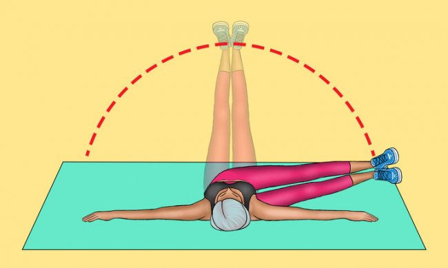 Поднимите ноги от земли сначала под углом 45°, используя мышцы живота, затем доведите до 90° и ненадолго задержитесь.