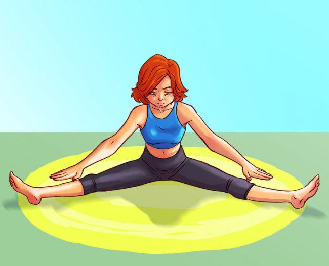 Техника. Сядьте с прямой спиной, расставьте ноги как можно шире. Вытягивая носки, на вдохе поднимите руки вверх и на выдохе наклоняйтесь как можно ниже, но не округляйте спину. Не пытайтесь опуститься ниже, если округляется спина, сохраняйте ее максимально прямой.