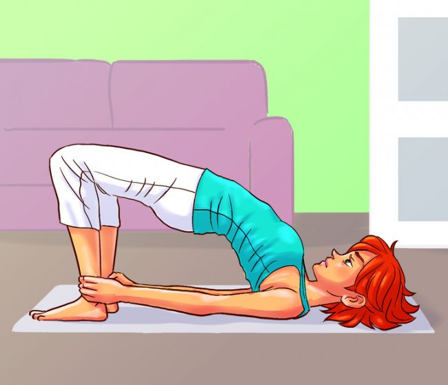Техника. Лягте на спину, согните ноги в коленях, стопы расположите на ширине плеч, руки вытяните вдоль туловища. Поднимите таз вверх и прогните спину, не отрывая плечи, шею и голову от пола.