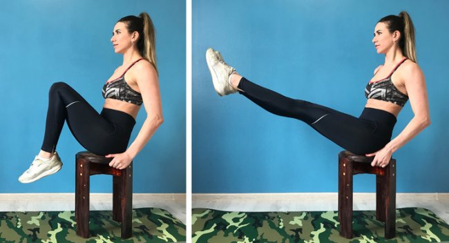 Далее динамическая нагрузка — нагружаем пресс. Сядьте на стул, поднимите ноги, сгибайте и разгибайте их в коленях 12 раз. Сделайте 3 подхода с небольшой передышкой.