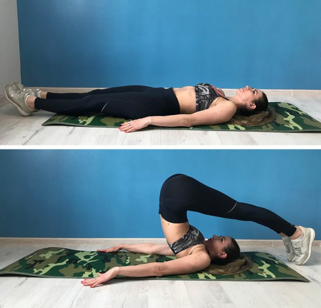 Упражнение для укрепления нижней части живота и спины — тут будут растягиваться мышцы поясницы и глубокие разгибатели спины. Лягте на спину и поднимайте ноги за голову за счет силы пресса 10 раз. Сделайте 2-3 подхода.