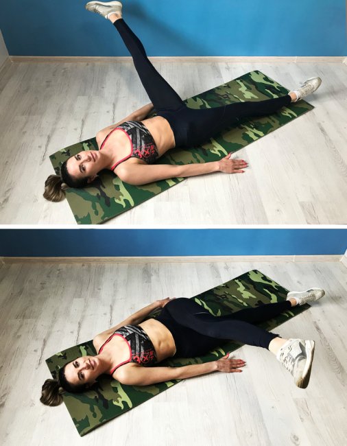 Несложное упражнение, совмещающее в себе работу пресса, спины и ягодичных мышц. Отведите ногу в одну сторону, а потом переместите ее по прямой в другую. Сделайте 10 раз на каждую ногу.