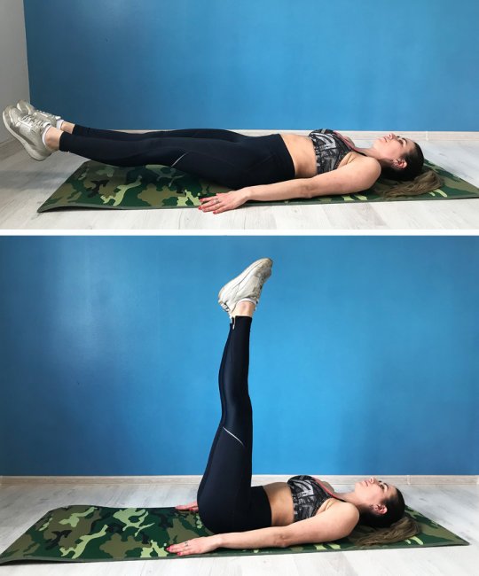 Знакомое многим упражнение для проработки пресса. Лягте на спину и поднимайте ноги до прямого угла. Прежде чем снова поднять ноги, задержитесь на несколько секунд в нижней точке. До пола ноги не опускаются. Сделайте 2 подхода по 10 повторений.