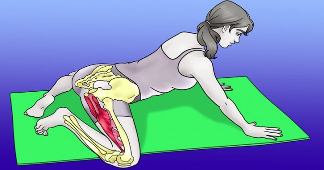 Поза лягушки: сядьте на пол так, чтобы ступни находились за ягодицами, и широко разведите колени. Не отрывая ног от пола, поднимите ягодицы и вытяните руки вперед так далеко, как только это возможно. Раздвигайте ноги, пока не почувствуете, как растягиваются мышцы бедер. Задержитесь в этом положении на 2 минуты.