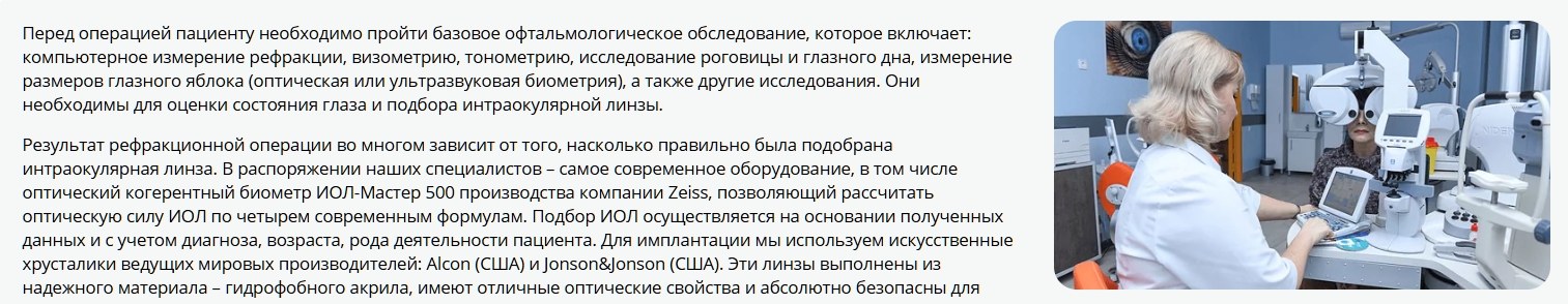 Эффективна для различных нарушений зрения: от миопии и гиперметропии до астигматизма и катаракты. В зависимости от состояния глаз и типа проблемы выбирается наиболее подходящий метод. Например, операция по замене хрусталика помогает при катаракте и нарушениях зрения, связанных с возрастными изменениями.Персонализированный подход