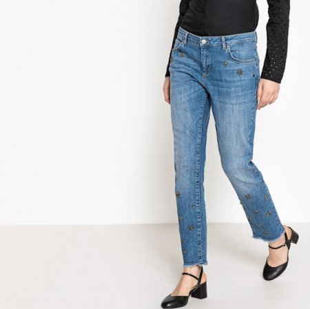 Джинсы с прямыми штанинами отлично подходят для невысоких женщин, потому что они «вытягивают» фигуру. Здесь снова рекомендуются более темные цвета. Избегайте джинсов с горизонтальными узорами, аппликациями, вышивкой или заплатками, потому что они оптически уменьшают фигуру.