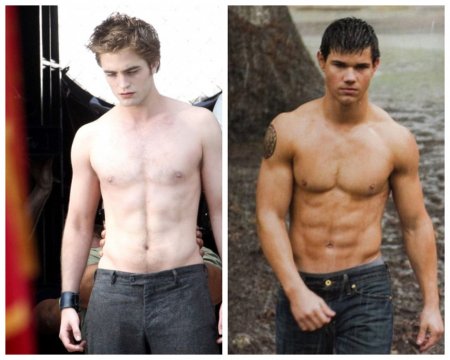 Роберт Патинсон и Тэйлор Лотнер в «Сумерках»В одной из частей «Сумерек», которые и прославили Роберта Паттинсона, ему пришлось снять футболку, но делал он это явно с неохотой (другое дело — в розовом парике сфотографироваться для глянца). Да и если сопоставить его тело с телом Тэйлора Лотнера, любившего обнажаться в том же фильме, то Роберт проигрывает по всем показателям (у него бледная кожа, а кубики вообще выглядят нарисованными). Впрочем, актер никогда не скрывал, что от качалки держится подальше, да и демонстрировать свое тело не любит. В интервью он даже как-то признался, что страдает дисморфофобией — расстройством, при котором особенно переживают из-за дефектов (мнимых или нафантазированных) своего тела. Да ладно, Роб, неужели у тебя под майкой и правда все настолько печально?