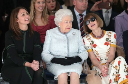 На показе королева сидела рядом с главным редактором американского Vogue Анной Винтур и с руководительницей Британского совета моды Кэролайн Раш.