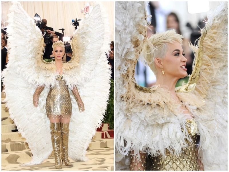 Кэти Перри перевоплотилась в ангела. Крылья певица благополучно сложила, сойдя с красной дорожки, но ее костюм в развернутом виде стал одним из самых интересных.