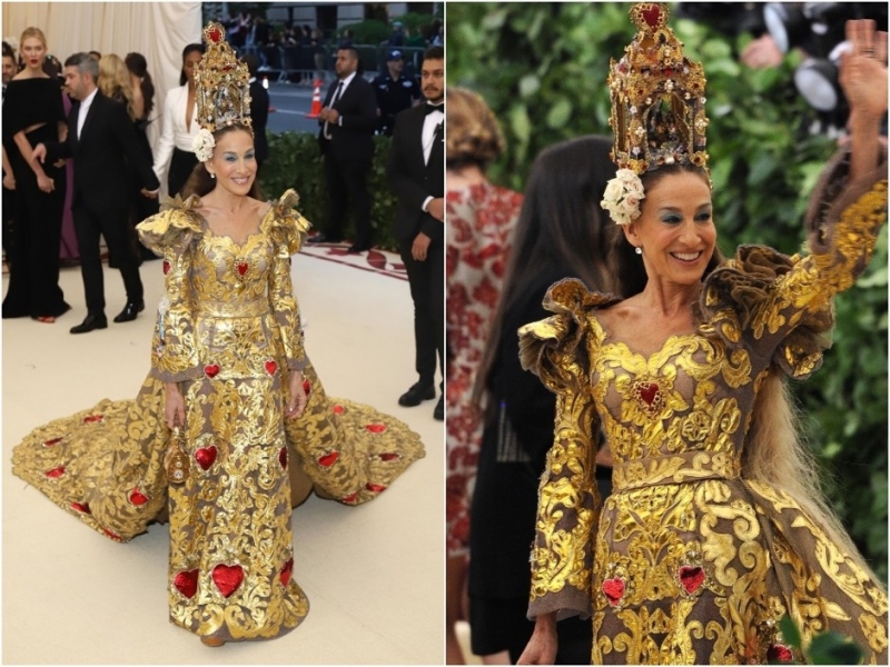 Приянка ЧопраСару Джессику Паркер на дорожке ждали чуть ли не больше всех. Модные критики и любители уже успели усвоить, что актриса очень ответственно подходит к созданию костюмов для Met Gala. Вот и в этот раз она не подвела и продемонстрировала настоящий королевский наряд с вертепом на голове. Этот образ точно не раз войдет в списки самых ярких выходов в истории Бала.