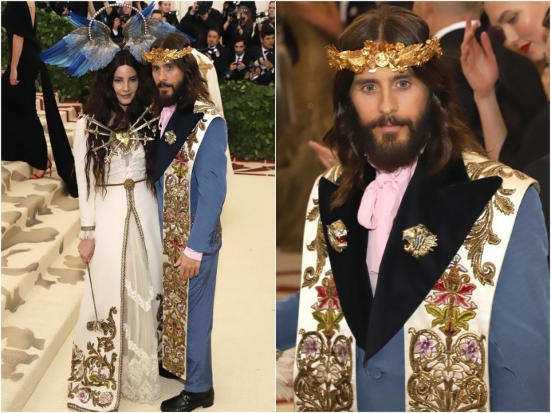 Ирина Шейк и Брэдли КуперЛана Дель Рей появилась в компании Джареда Лето и создателя костюмов обоих певцов — Алессандро Микеле (креативного директора Gucci). Джаред, кажется, был рожден для царских нарядов, поэтому костюмчик сел как влитой, а вот Лана в таких образах появляется крайне редко, тем интереснее рассматривать детали ее костюма — нимб с крыльями и средневековое платье с вышивкой, перекликающейся с узором на стомле (деталь облачения католических священников).