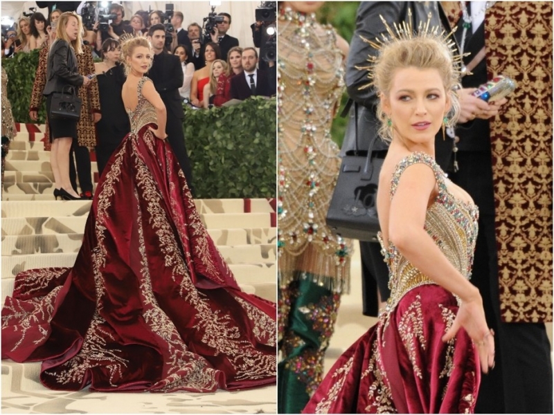 Алессандро Микеле, Лана Дель Рей, Джаред ЛетоБлейк Лайвли появилась в образе королевы — порой кажется, что она в принципе живет в этом образе каждый день. Идеальна каждая деталь костюма — объемная атласная юбка бордово-красного цвета со шлейфом и вышивкой золотом, корсет, богато расшитый камнями, и завершающая деталь — ободок с шипами и драгоценными камнями. Всю эту роскошь создали мастера Модного дома Versace.