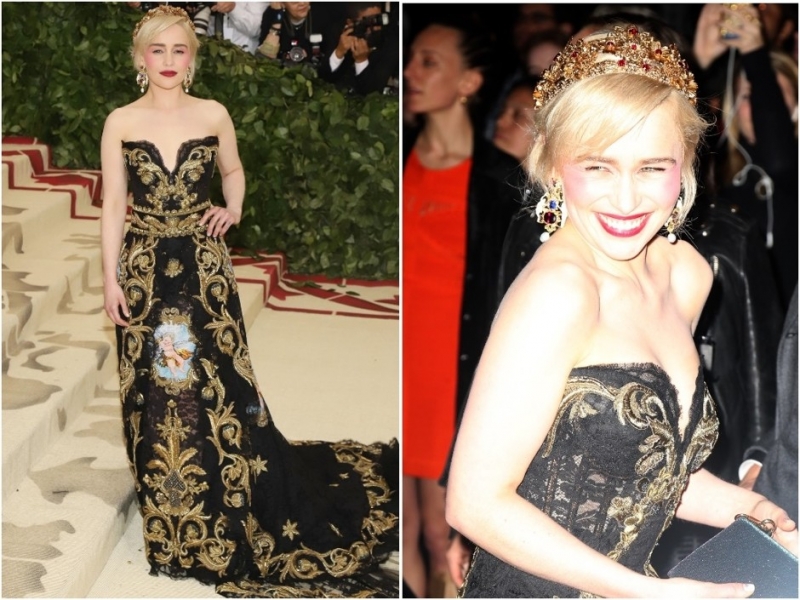 Блейк ЛайвлиЭмилия Кларк поступила очевидным образом и пришла за нарядом в Модный дом Dolche&Gabbana, который выпускает чуть ли не коллекцию за коллекцией в подобном духе.