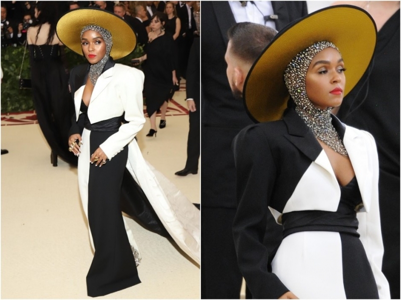 Соланж НоулзПевица Жанель Монэ выбрала спокойный черно-белый наряд, который намекает на облачение монахинь, а вот дополнила все широкополой шляпой, надетой поверх «кольчуги», созданной из прозрачного материала и кристаллов.