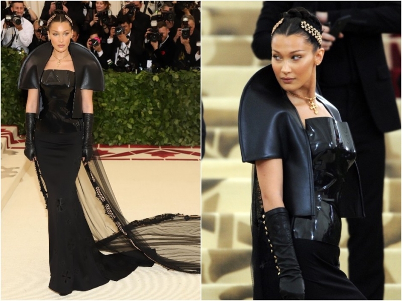 Жанель МонэБелла Хадид — готическая королева. Тиара, объемная накидка, корсет, перчатки, шлейф — все имеется.