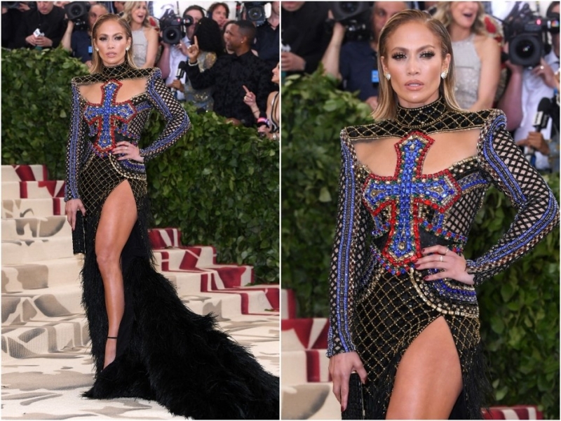 Кара ДелевиньДженнифер Лопез — дива в любом наряде. На Met Gala она не надевает экстравагантные костюмы вроде тех, что выбирают Рианна или Кэти Перри, но неизменно появляется в элегантных платьях с любопытными деталями в декоре. На этот раз ими стали большой расшитый крест на груди и густой шлейф из перьев.