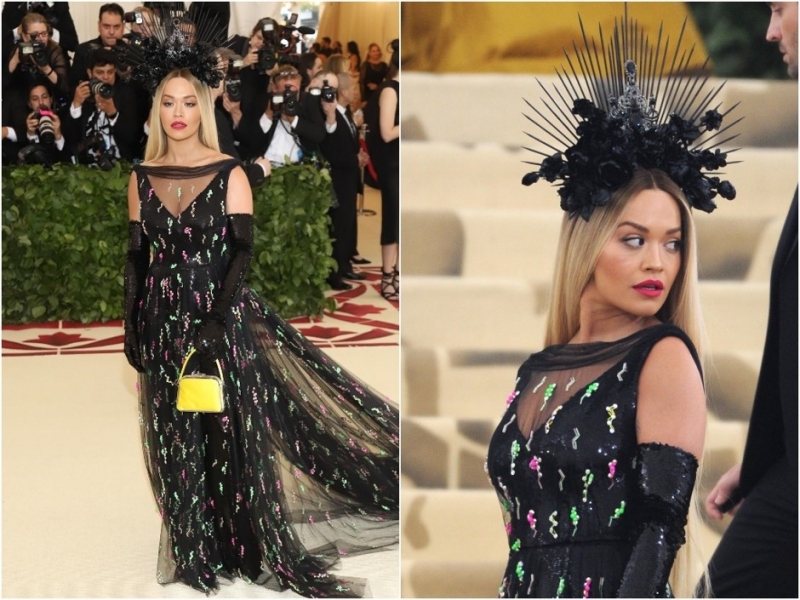 Дженнифер ЛопезРита Ора платье выбрала довольно спокойное, а вот ободку с такими шипами и черными цветами позавидовала бы даже Урсула.