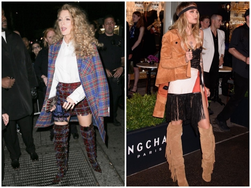 Хлоя Севиньи на вечере Planned Parenthood Spring Gala (слева) и Лили Коллинз на показе Prada Resort (справа)Актриса Блейк Лайвли и дочь Майкла Джексона Пэрис Джексон будто бы пришли на одну тематическую вечеринку. У Блейк — вариация на шотландский национальный костюмчик, у Пэрис — восхваление индейцев. Девушки, лето на носу, вам не жарко в бахроме и длинных сапожках?