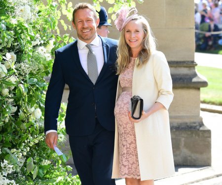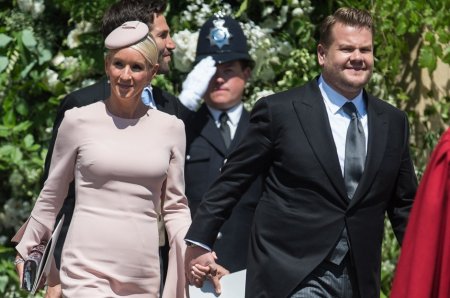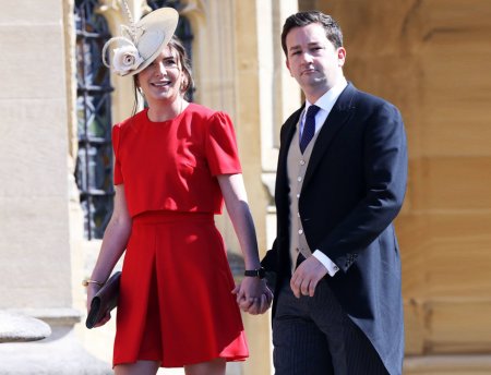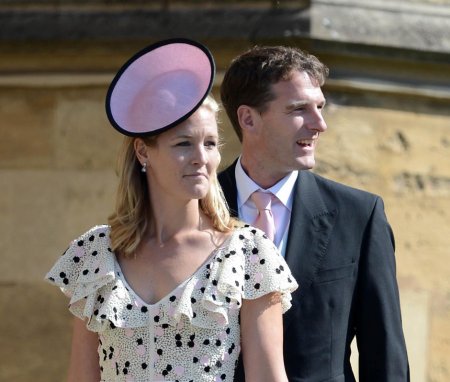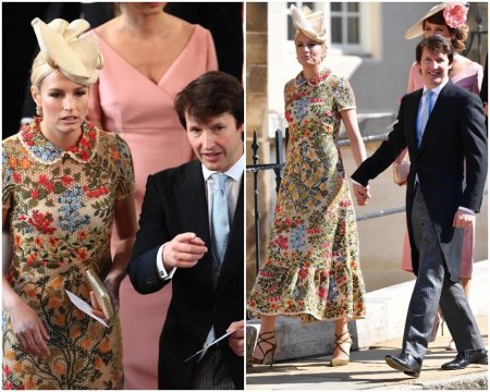 Друг принца Гарри, британский певец Джеймс Блант приехал со своей супругой Софией Уэллсли, которая выбрала для торжества платье с цветочным принтом и круглым воротничком и шляпку кремового цвета.
