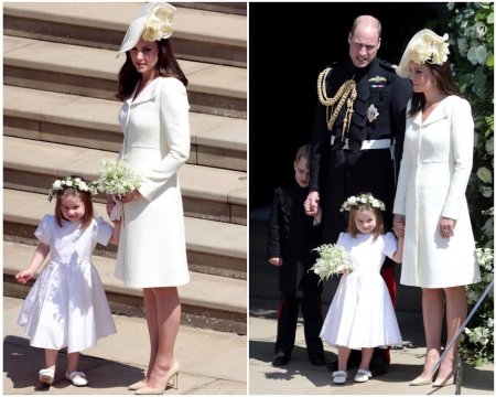 Кейт Миддлтон вновь не изменила любимому британскому бренду Alexander McQueen, надев на свадьбу платье-пальто сливочного цвета. Образ герцогини получился нежным и сдержанным. До свадьбы Гарри и Меган Кейт уже надевала этот наряд и повторила свой выход, вероятнее всего, для того чтобы не привлекать к себе излишнее внимание.