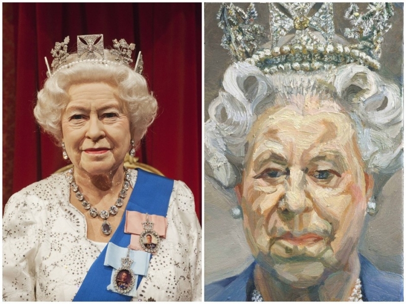Люсьен Фрейд «Ее Величество королева Елизавета II» — справа. Слева — восковая фигура королевы Елизаветы II.Художник, который приходился внуком создателю психоанализа Зигмунду Фрейду, и сам был неплохим психологом. Он писал портреты не в угоду моделям, а по своим беспристрастным представлениям. И даже британскую королеву изобразил без грамма заискивания. Перед нами уставшая пожилая женщина с плотно сжатыми губами и жестким взглядом, из королевского в ней — только диадема. Неудивительно, что особо преданные поклонники королевской семьи мечтали посадить Люсьена Фрейда в тюрьму за такое неуважительное отношение к образу монаршей особы. Но сама Елизавета осталась портретом довольна. Сейчас картина хранится в Виндзорском замке в Лондоне.