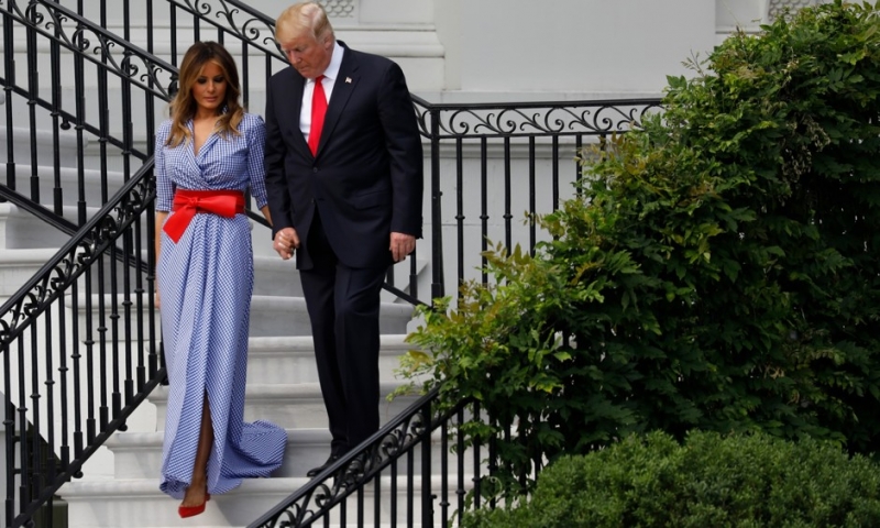 Мелания выбрала наряд от Ralph Lauren, дополнив образ кожаным красным поясом Alexander McQueen и туфлями на шпильке Christian Louboutin. Отметим, что по лестнице Белого дома супруги спускались, крепко держась за руки, тем самым показав, что в их отношениях царит идиллия.
