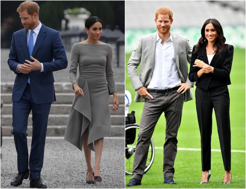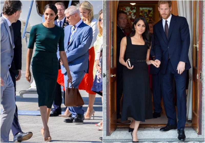 Сначала Маркл была замечена в аэропорту Дублина, куда прибыла в изумрудном платье Givenchy. Образ герцогиня дополнила сумкой Strathberry. Позже Меган и Гарри посетили торжественный прием в резиденции британского посла. Герцогиня была одета в черное платье Emilia Wickstead и держала в руках шелковый клатч Givenchy. Дополнила наряд Меган туфлями на шпильке Aquazzura и бриллиантовыми сережками Birks.